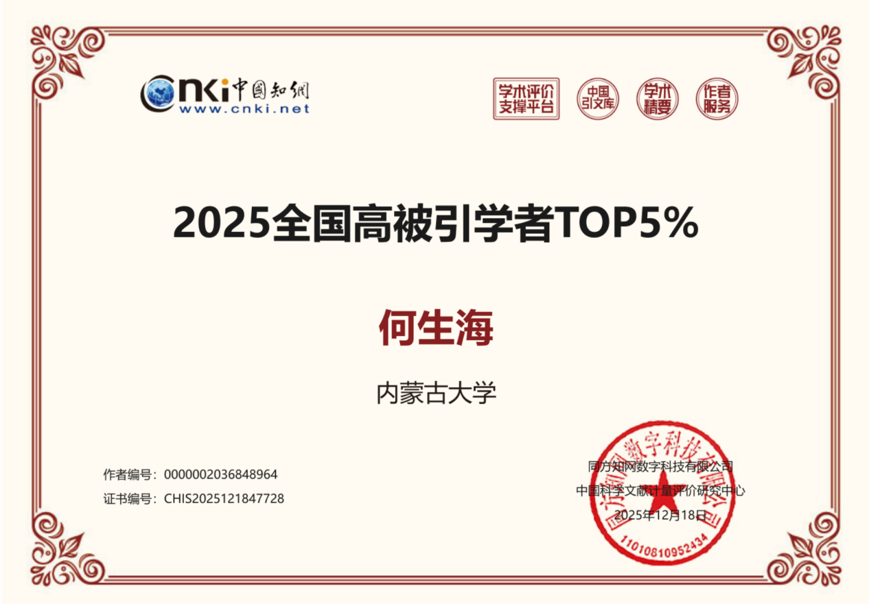 近日,中国知网下属的中国科学文献计量评价研究中心基于中国知网收录的国内学术成果,开展了学者学术影响力客观评价。知网评价中心遴选并发布了“2025全国高被引学者”名单。内蒙古大学铸牢中华民族共同体意识研究地基首席专家何生海教授入选“中国知网高被引学者top5%”名单。