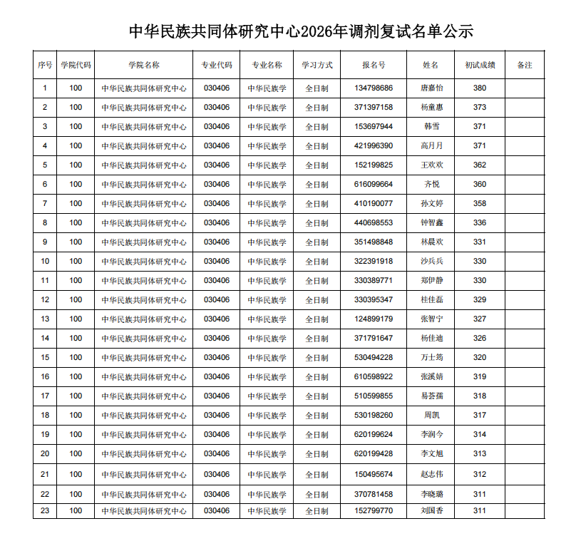 中华民族共同体研究中心2026年调剂复试名单公示2026-04-08 文字: