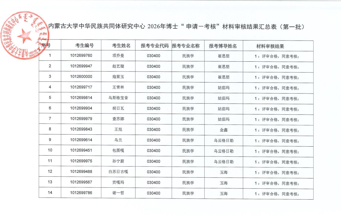 内蒙古大学中华民族共同体研究中心2026年博士“申请—考核”材料审核结果汇总表(第一批)